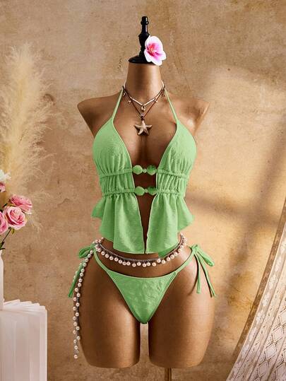 Bellisia Women's Summer Vacation Beach Textured Halter Tankini Set - Green - View 1