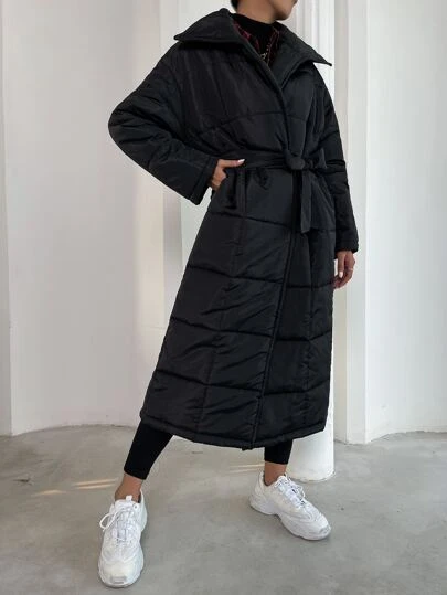 Belted Longline Padded Padded Coat Clothes Winter - Black - View 1