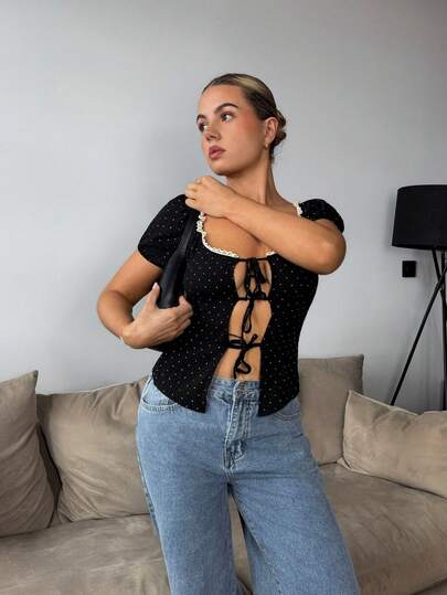 Bethéva Áo sơ mi nữ tay bồng chấm bi vá ren đen trắng buộc dây phía trước, phù hợp cho mùa xuân, hè, thu