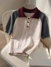 Franclia Fashionable Blogger-Inspired 2 In 1 Patchwork Knit Cropped Cardigan, European & American Style Navy Blue Cardigan Sweater Cable Knit Cardigan Women Preppy Sweater Navy Cardigan Collared Cardigan