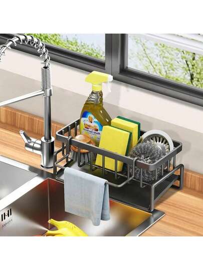 Black Kitchen Sink Sponge Rack With Automatic Drain Tray Kitchen Sink Storage Rack Self-Draining Dish Soap Sponge Holder Countertop-Friendly ABS Plastic - Multicolor - View 1