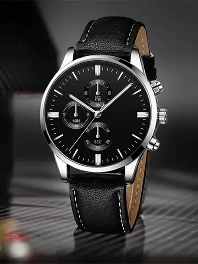 Black PU Leather Strap Fashion Round Quartz Watch For Men, For Daily Life - Black - View 1