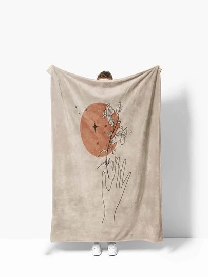 1pc Floral & Hand Pattern Blanket, Modern Line Hand Print Knitted Fabric Blanket For Bed - Multicolor - View 1