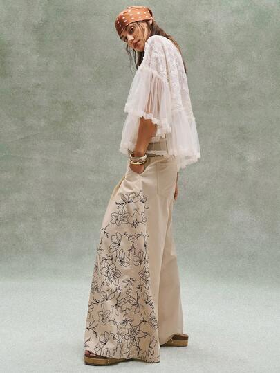 Bohemela Boho Countryside Vacation Women's Casual Wide Leg Printed Straight Leg Jeans - Khaki - View 6