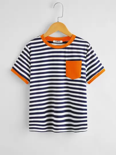 SHEIN Boys Pocket Patched Striped Ringer Tee - Blue and White - View 1