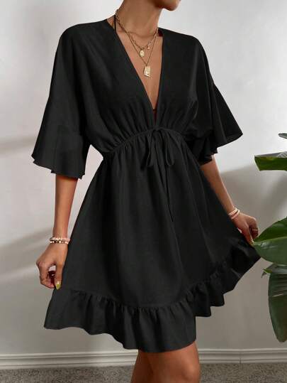 Breezaya Solid Ruffle Hem Tie Front Cover Up,Summer Beach - Black - View 1