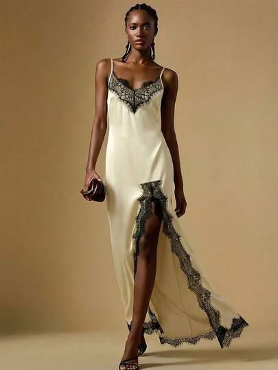 Briarwyn Women's Cold-Shoulder Spaghetti Strap Black Lace Patchwork High Slit Hem Dress - Ivory White - View 1