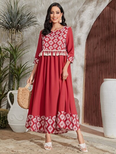 Al Najma Burgundy Red Geo Print Tassel Trim Smock Dress - Burgundy - View 1
