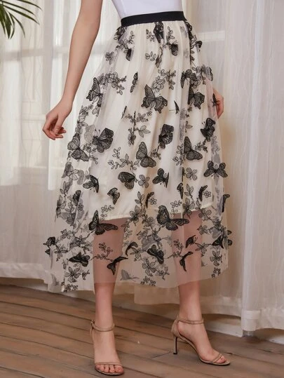 SHEIN Butterfly Patched Mesh Skirt - Beige - View 1