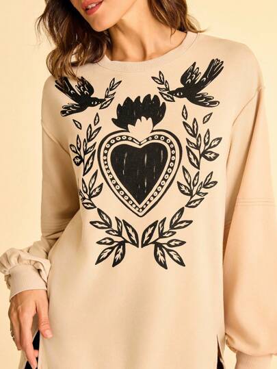 CAJUNI Women's Vacation Casual Fun Bird & Plant Print Sweatshirt With Split Hem And Puff Sleeves In Fall/Winter - Multicolor - View 1