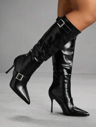 CUCCOO SZL Fashionable Women's Pointed Toe Knee-High Boots With Buckle Design - Black - View 1