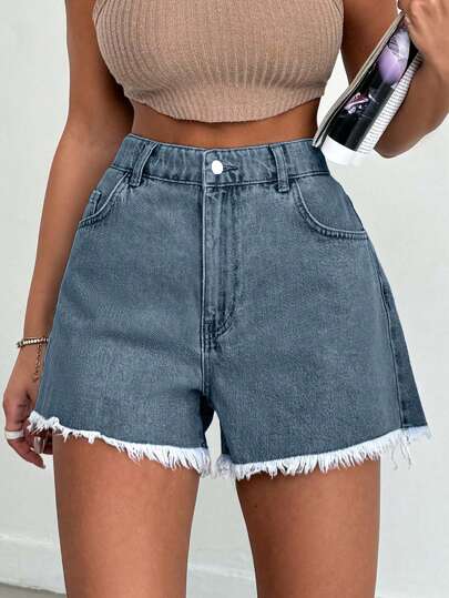 EURMUSE 100%Cotton Women's Light Blue Frayed Hem Denim Shorts With Stone Wash - Blue - View 1