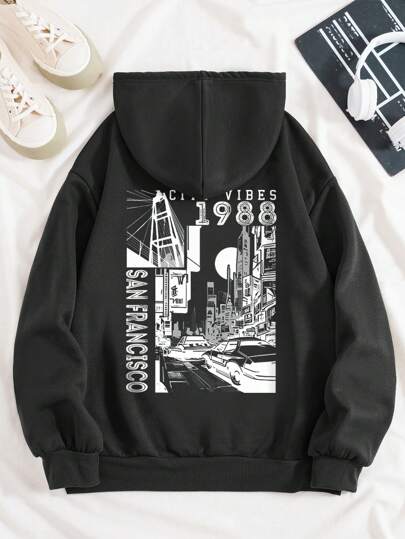 SHEIN EZwear Car & Letter Graphic Drawstring Thermal Lined Hoodie - Black - View 1