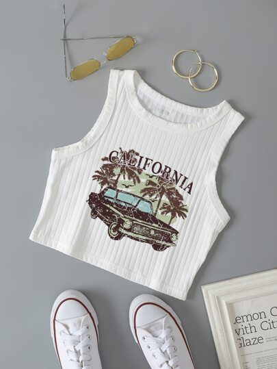 INAWLY Car & Letter Graphic Ribbed Knit Tank Top - White - View 1