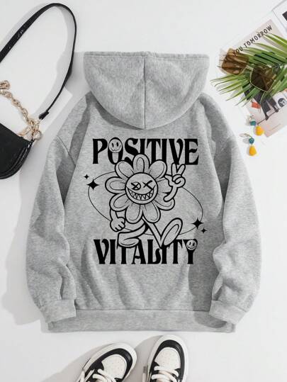 SHEIN EZwear Cartoon & Letter Graphic Drawstring Thermal Lined Hoodie - Grey - View 1