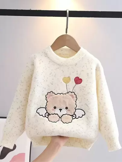 Cartoon Bear Embroidered Crew Neck Long Sleeve Sweater, Suitable For Young Girls In Autumn/Winter - White - View 1