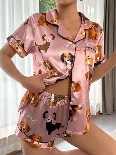 Cartoon Graphic Contrast Piping Satin PJ Set / Pajama Set - Dusty Pink - View 1