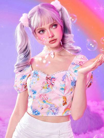 ROMWE X Care Bears Cartoon Graphic Puff Sleeve Crop Blouse - Pink - View 1