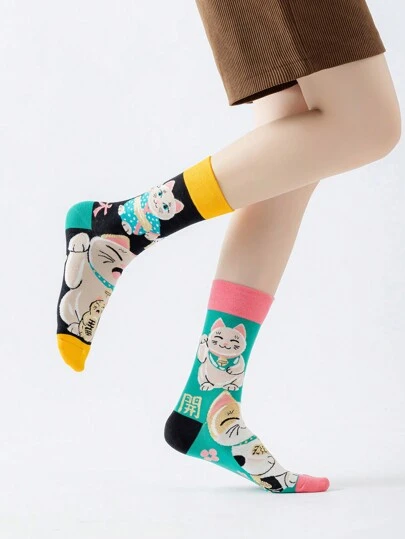 Cartoon Lucky Cat With Sparkling Lines Women's Mid-Calf Socks - Multicolor - View 1