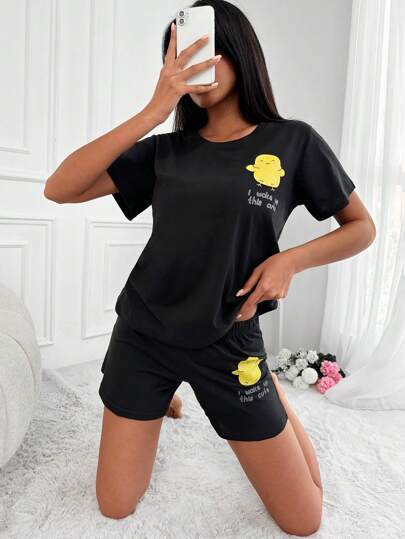 EURMUSE Cartoon & Slogan Graphic PJ Set - Black - View 1