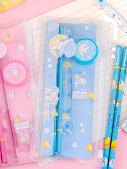 Cartoon Stationery Set Including Pencil Case, Pencil Bag, And Pen Holder. Perfect Reward Prize For Primary School Students. 6pcs/set. - Blue - View 1