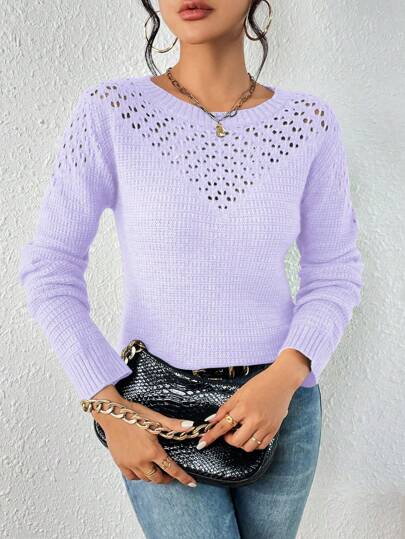 SHEIN LUNE Casual Minimalist Solid Color Hollow Out Knit Sweater, Autumn/Winter Knit Pullover Fall - Mauve Purple - View 1