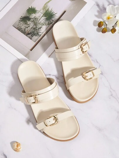 Casual White Metal Square Toe Flat Sandals Slippers With Buckle, Perfect For Holiday - White - View 1