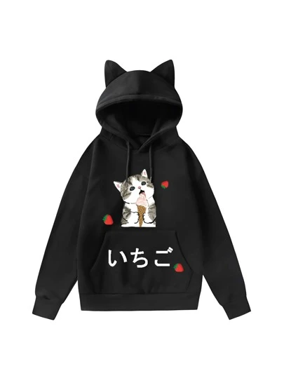 Cat Sweatshirt With Strawberry Ice Cream Printed Ears - Black - View 1
