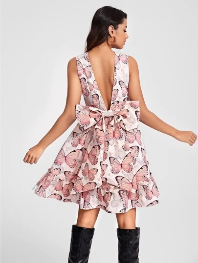Caterine Sanchez Butterfly Print Bow Back Ruffle Hem Dress - Multicolor - View 1