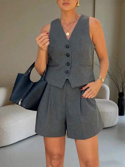 SHEIN Clasi Plus Size Sleeveless Blazer Vest And Shorts Set Graduation,Back To School,Teacher Outfits For Women - Dark Grey - View 1