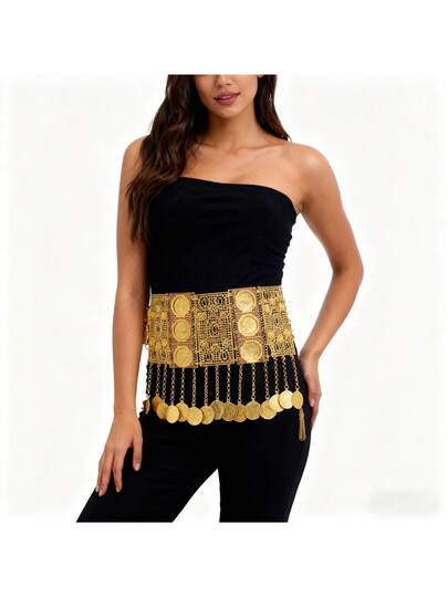 Chain Geometric Tassel Waist Chain, Carved Waterdrop Coin Pendant Waist Belt, Middle Eastern Belly Dance Waist Accessory - Gold - View 1