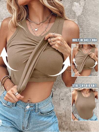 ChicMe Built-In Bra Sleeveless Ribbed Knit Tank Top Slim Fit Round Neck Basic Top - Khaki - View 1