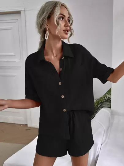 Chiquease Drop Shoulder Dual Pocket Shirt & Shorts - Black - View 1