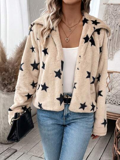 Chiquease Star Print Open Front Fuzzy Coat - Apricot - View 1