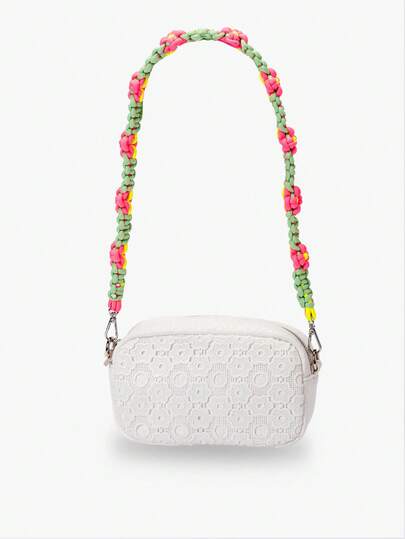 Cloud White Lace Hollow Floral Woven Bag, Bohemian Style Shoulder Bag, Handmade Contrast Color Floral Decor Handbag With Woven Strap, Crossbody Bag, Tote Bag (Pattern Random), Spring New Women Bag, Suitable For Daily Shopping, Travel And Vacation Essentials - White - View 1