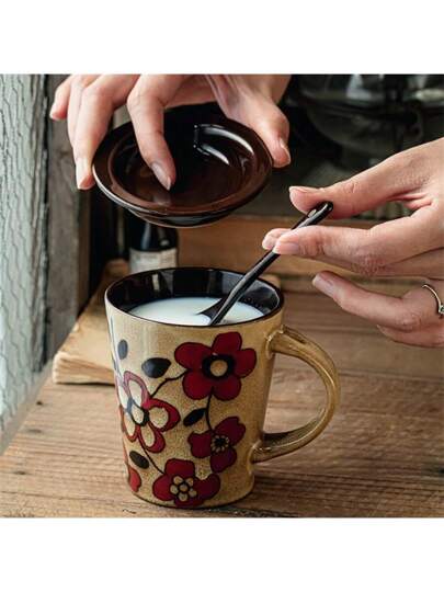 Coffee Cup Hand-Painted Chinese Style Ceramic Mug With Lid Spoon, High Aesthetic Red Cup, Birthday Gift - Multicolor - View 1