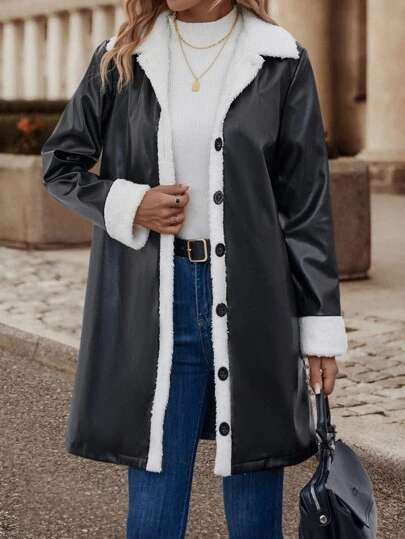 Color Block Teddy Lined PU Coat - Black and White - View 1