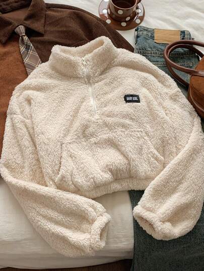 Comfortcana Summer Outfits Women's Half Zipper White Fleece Sweatshirt With Letter Patch Design,Long Sleeve Tops In Fall/Winter - Beige - View 6
