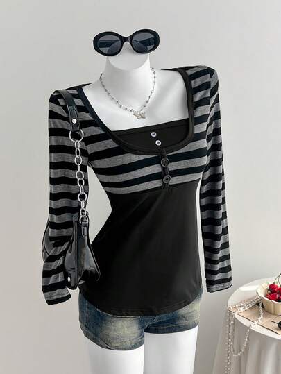 Comfortcana Women's Casual Punk Style Striped T-Shirt - Dark Grey - View 1