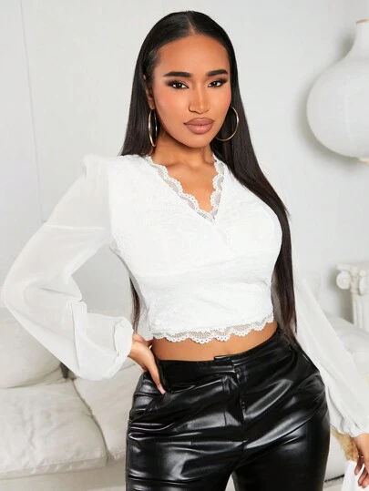 SHEIN SXY Contrast Lace Lantern Sleeve Crop Top - White - View 1