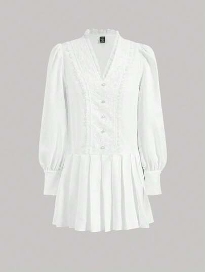 SHEIN MOD Contrast Lace Pleated Hem Dress - White - View 1