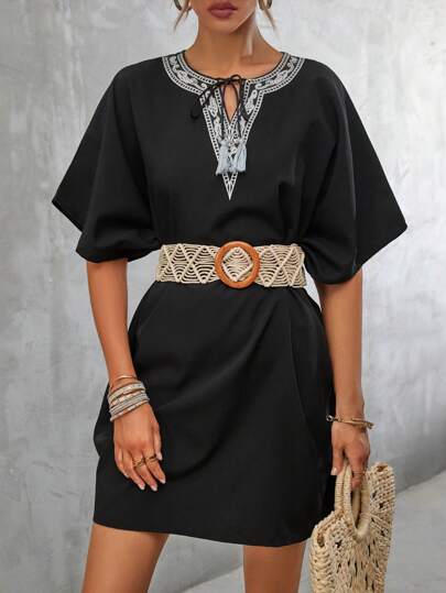 SHEIN Clasi Contrast Lace Tie Neck Batwing Sleeve Dress Without Belt - Black - View 1