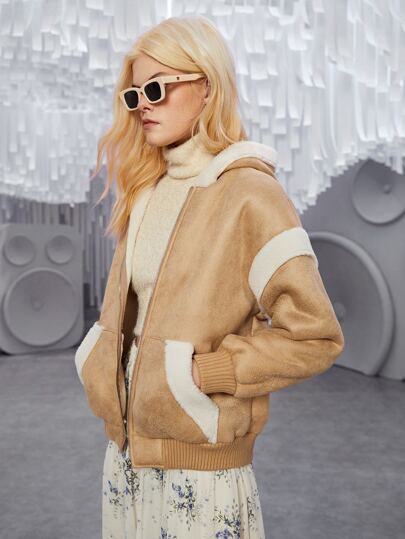 SHEIN Contrast Panel Drop Shoulder O-ring Zipper Hooded Thermal Coat - Khaki - View 1