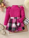 2pcs/Set Young Girls Casual Puff Sleeve Tops & Bow Plaid Skort, Fashion Outfits