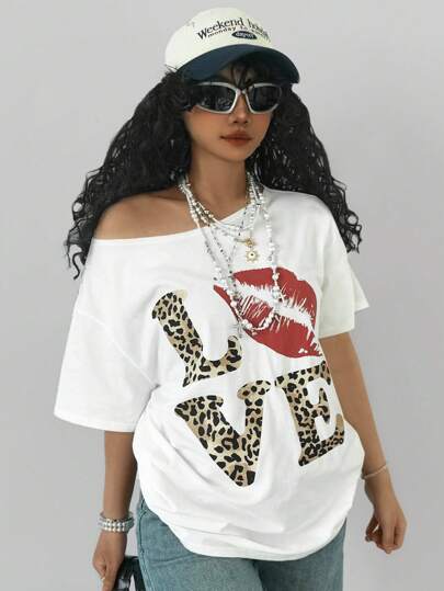 SHEIN Tween Girls Spring/Summer Letter & Leopard Print Asymmetric Collar Loose Casual T-Shirt - White - View 1