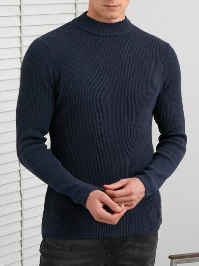 SHEIN Cottnline Men Solid Ribbed Knit Sweater - Navy Blue - View 1