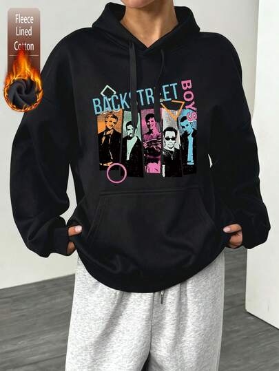Cotton Women's Top, Backstreet Boys-Themed Black Fleece-Lined Hooded Sweatshirt, Women's Drop-Shoulder Hoodie, Autumn/Winter Thick Fabric Warm Loose-Fit Hooded Jumper, Suitable For Cold Weather. - Black - View 1