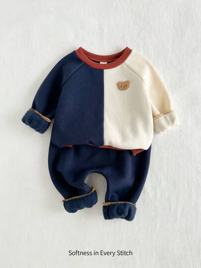 Cozy Pixies 2pcs Baby Boy Bear Graphic Pullover Sweatshirt & Drawstring Pants Fall/Winter Set - Navy Blue - View 1