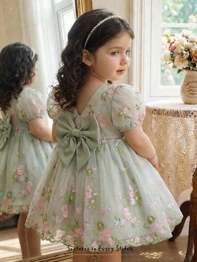 Cozy Pixies Baby Girl Floral Print Round Neck Puff Sleeve Waist Cinched Dress - Multicolor - View 4