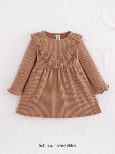 Cozy Pixies Baby Girls' Solid Color Knit Soft Round Neck Long Sleeve Ruffle Waist Dress - Khaki - View 1